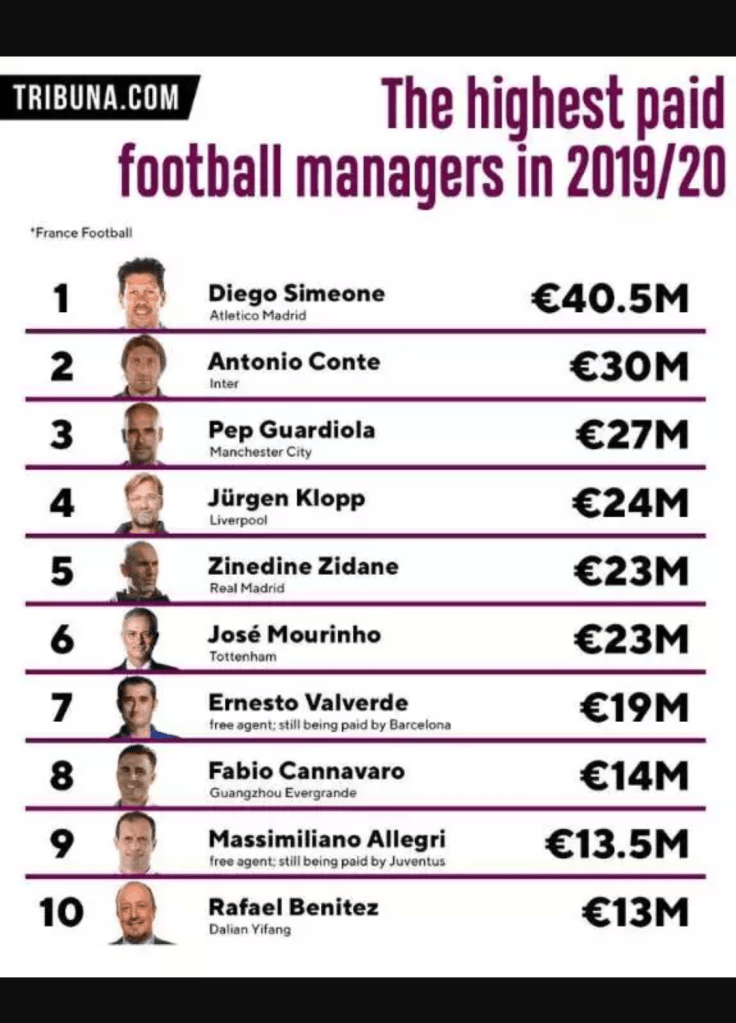 Meanwhile, Klopp’s recent opponent, Atletico Madrid boss Diego Simeone, has been the boss with the rankings with a staggering annual income of €40.5m.